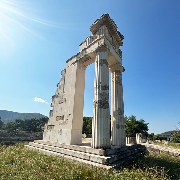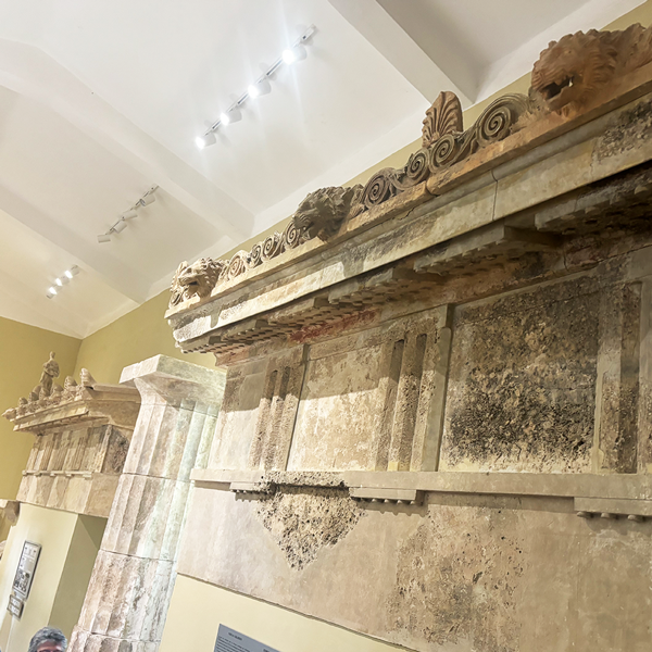 医療施設のすぐ近くには「トロス」という円形の霊廟があります。特別な儀式に用いられていたとされ、当時は豪華な装飾が施されていました。その一部は遺跡内の博物館に展示されています。