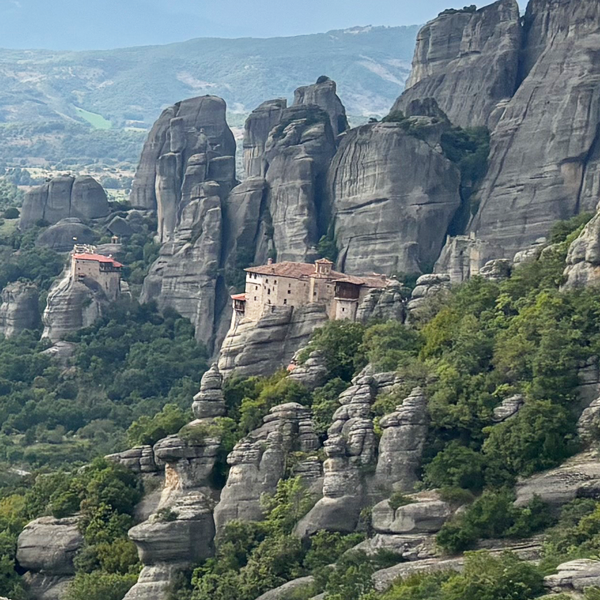 ギリシャ中部テッサリア地方に点在する奇妙な岩山群。高いものでは地上500メートル以上にもなり、それらの上にギリシャ正教の修道院が建てられています。