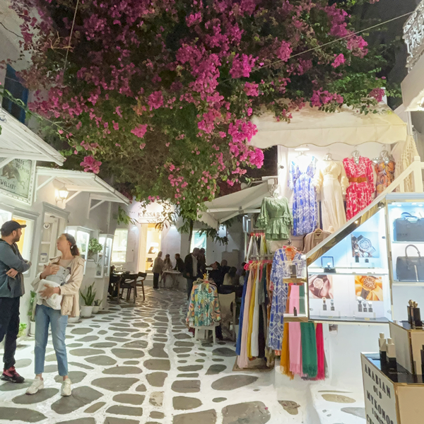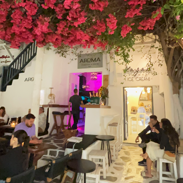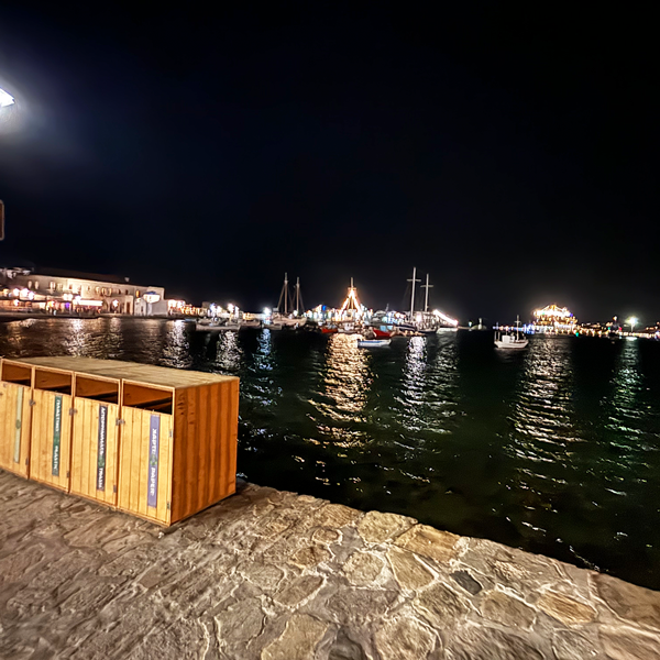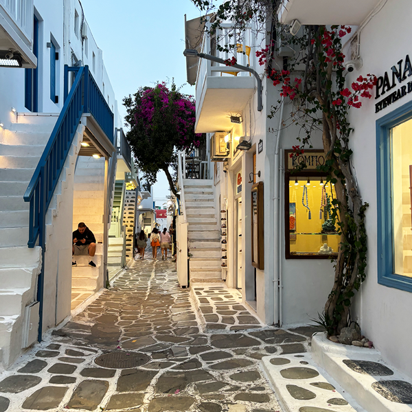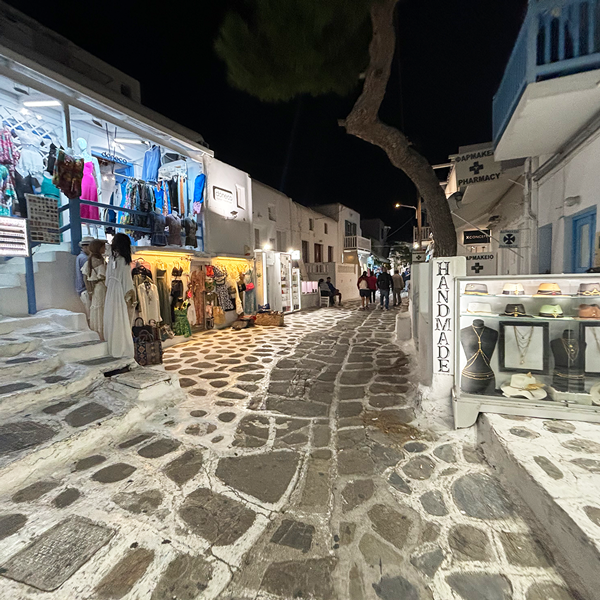 食事を終えた私は、夜のミコノスタウンを歩きながらホテルへ戻ります。夜も活気がありながら落ち着いた雰囲気のミコノスタウン。途中ポテチとビールを購入し、ホテルに戻りベランダで1人乾杯。夜景の素敵な夜でした。