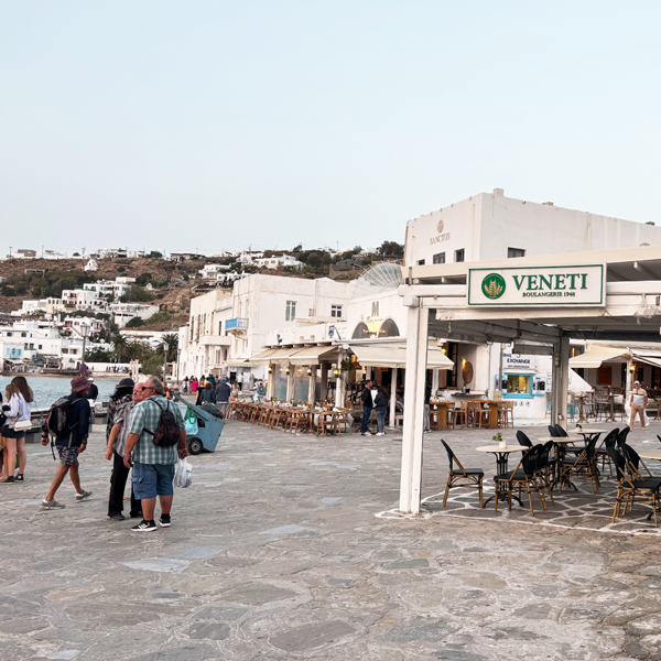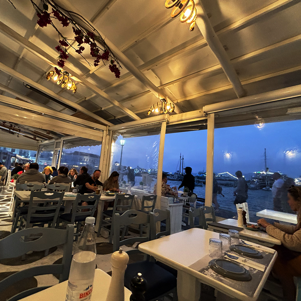 ミコノスではパラダイスビーチにて日光浴と海水浴を楽しみました。そのため体は日焼けで心地いいヒリヒリ感。ビーチからホテルに戻り、海パンを洗濯した後、夕食を求めミコノス港へ繰り出します。海沿いの町では是非魚介類を食べようと決めていた私。まだ食べていない魚介の名物がメニューに書いてあるタベルナを探します。