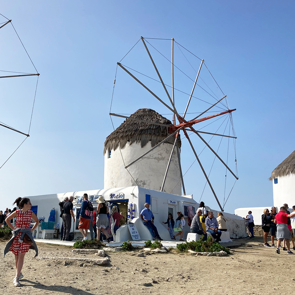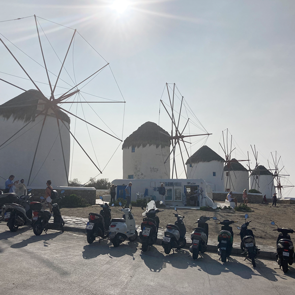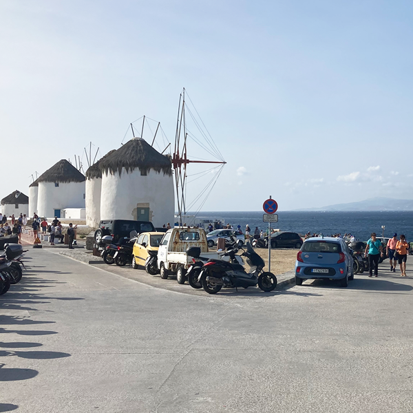 ミコノス島の象徴ともいえるスポット。風車がずらりと並ぶ。