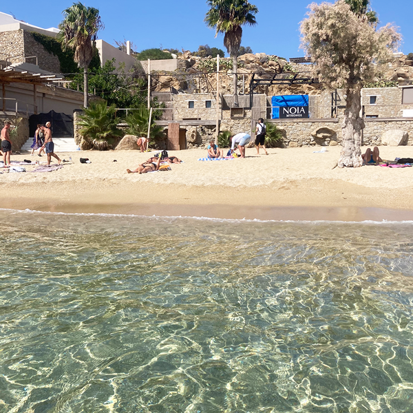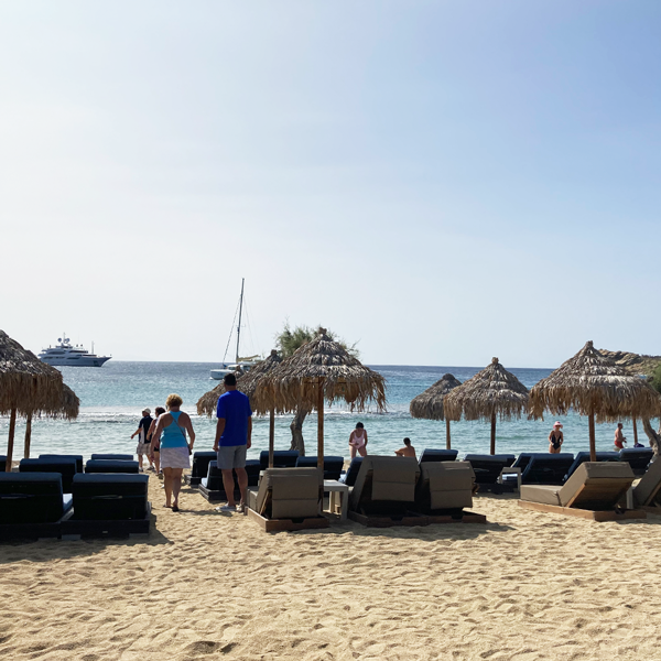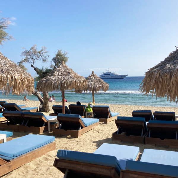 ミコノス島のビーチの一つ。家族連れからパリピまで楽しめる。